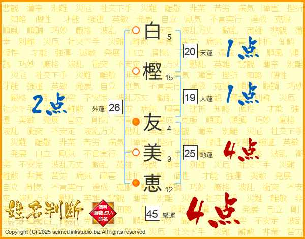 白(5画)樫(15画) 友(4画)美(9画)恵(12画)