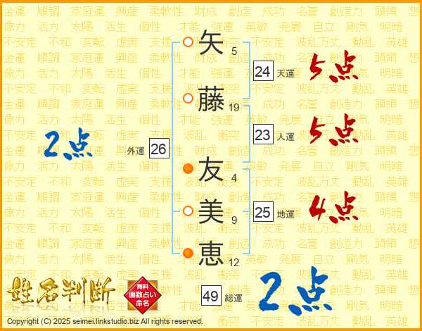 矢(5画)藤(19画) 友(4画)美(9画)恵(12画)
