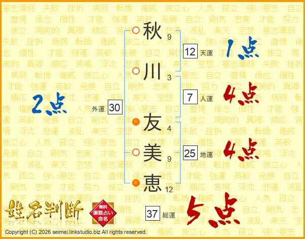 秋(9画)川(3画) 友(4画)美(9画)恵(12画)