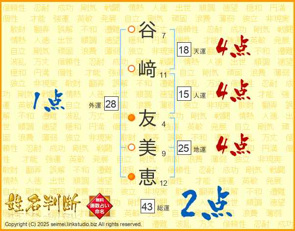 谷(7画)﨑(11画) 友(4画)美(9画)恵(12画)
