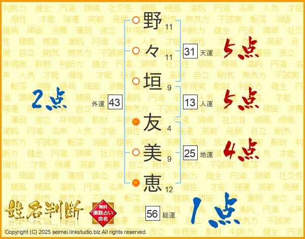 野々垣友美恵さんの人運は13画の5点!