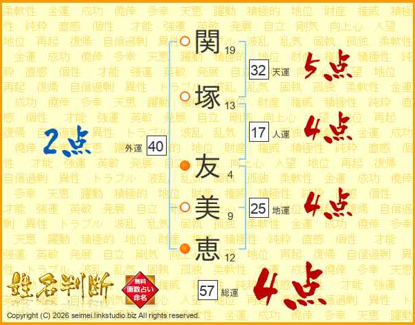関(19画)塚(13画) 友(4画)美(9画)恵(12画)