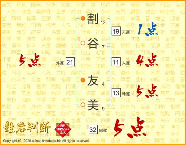 割谷友美さんの総運は32画の5点!