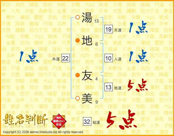 湯(13画)地(6画) 友(4画)美(9画)
