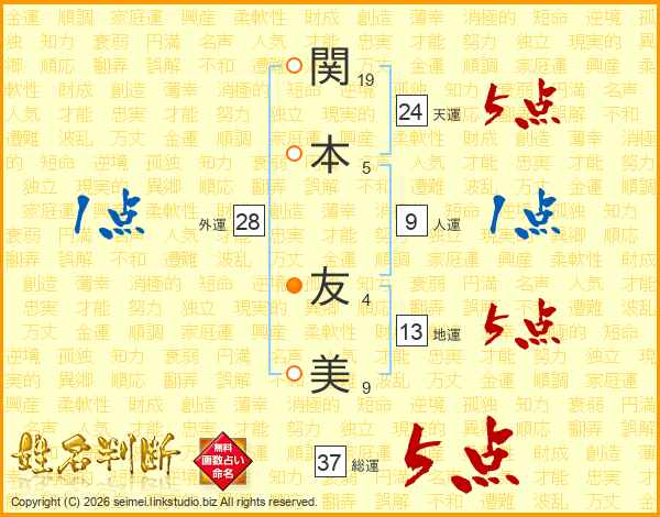 関(19画)本(5画)  友(4画)美(9画)