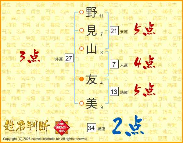 野(11画)見(7画)山(3画) 友(4画)美(9画)