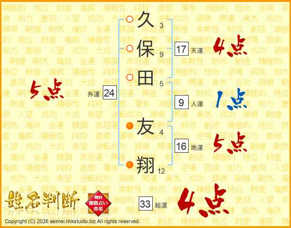 久(3画)保(9画)田(5画) 友(4画)翔(12画)