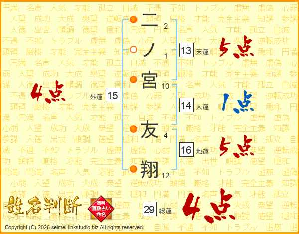 二ノ宮友翔さんの総運は29画の4点!