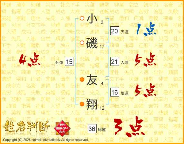 生活面を象徴する運勢です。外部から受ける影響力を表し、結婚運、家庭運や職場、環境への順応性を表します。総運から人運を引いた画数。姓や名が1文字の場合を除く。