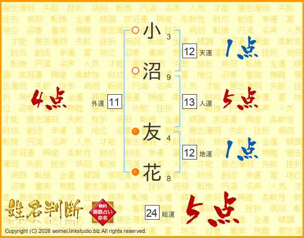 生活面を象徴する運勢です。外部から受ける影響力を表し、結婚運、家庭運や職場、環境への順応性を表します。総運から人運を引いた画数。姓や名が1文字の場合を除く。