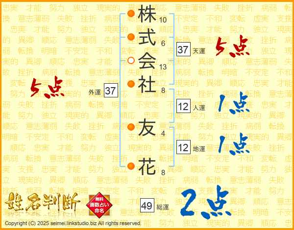 生活面を象徴する運勢です。外部から受ける影響力を表し、結婚運、家庭運や職場、環境への順応性を表します。総運から人運を引いた画数。姓や名が1文字の場合を除く。