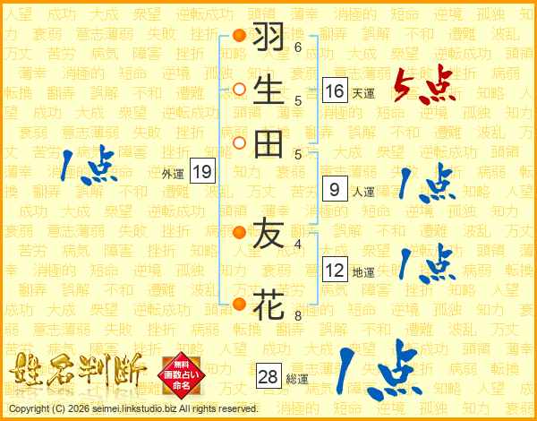 羽(6画)生(5画)田(5画) 友(4画)花(8画)