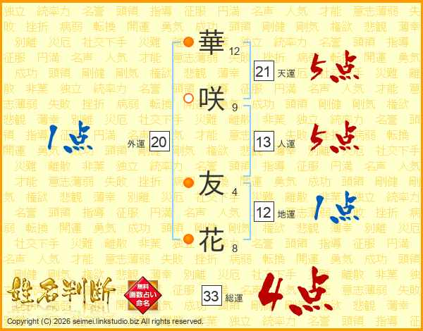 華咲友花さんの総運は33画の4点!