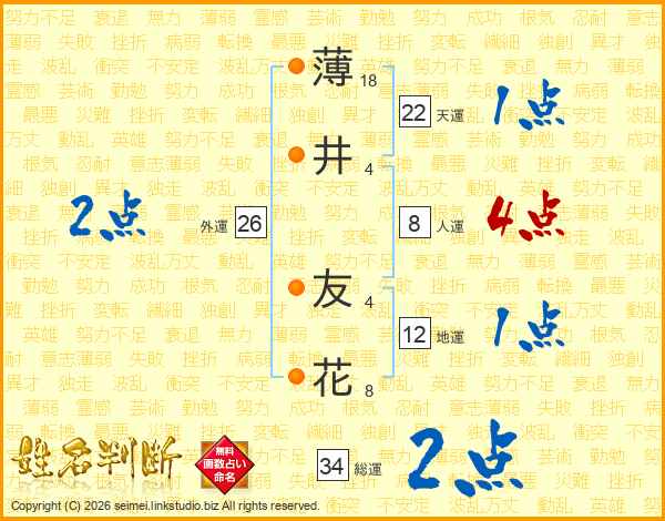 薄(18画)井(4画) 友(4画)花(8画)