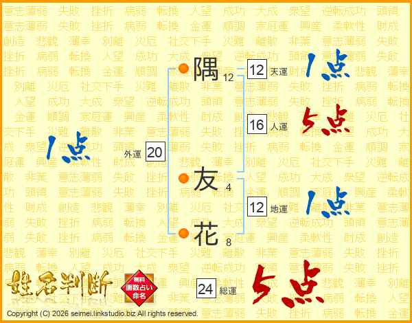 生活面を象徴する運勢です。外部から受ける影響力を表し、結婚運、家庭運や職場、環境への順応性を表します。総運から人運を引いた画数。姓や名が1文字の場合を除く。