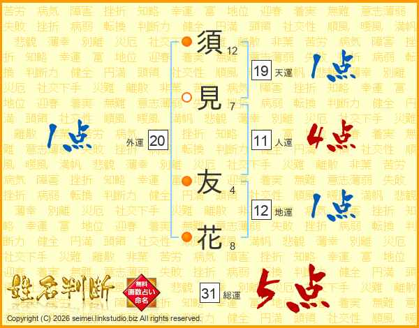 生活面を象徴する運勢です。外部から受ける影響力を表し、結婚運、家庭運や職場、環境への順応性を表します。総運から人運を引いた画数。姓や名が1文字の場合を除く。
