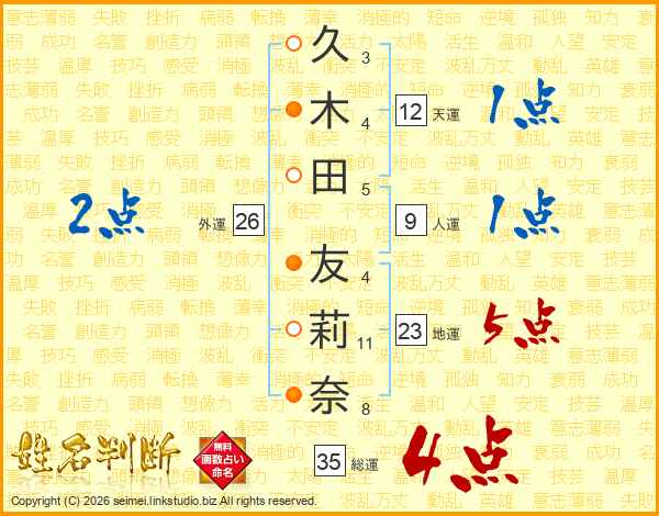 久(3画)木(4画)田(5画) 友(4画)莉(11画)奈(8画)