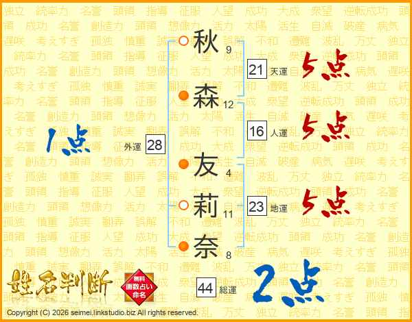 秋(9画)森(12画) 友(4画)莉(11画)奈(8画)