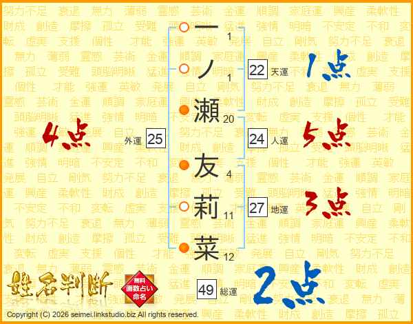 一(1画)ノ(1画)瀬(20画) 友(4画)莉(11画)菜(12画)