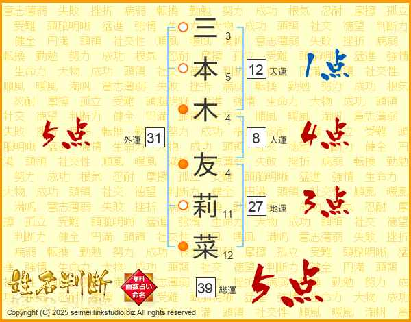 三(3画)本(5画)木(4画) 友(4画)莉(11画)菜(12画)