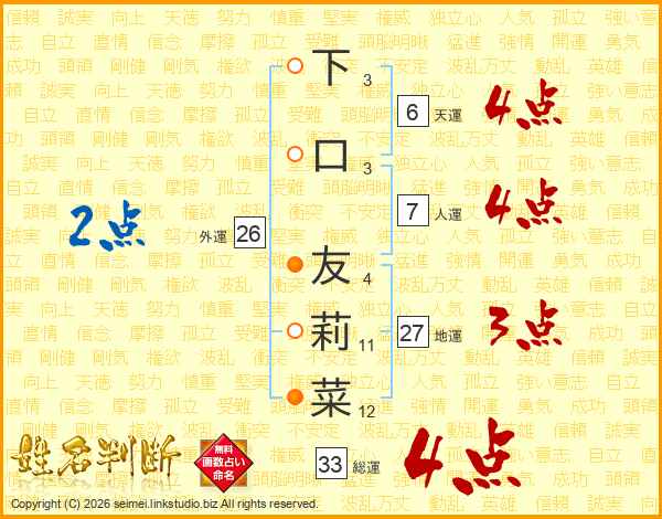 下口友莉菜さんの総運は33画の4点!