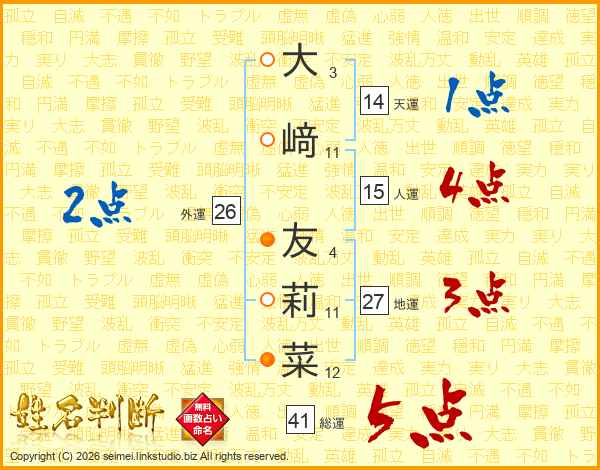 大(3画)﨑(11画) 友(4画)莉(11画)菜(12画)