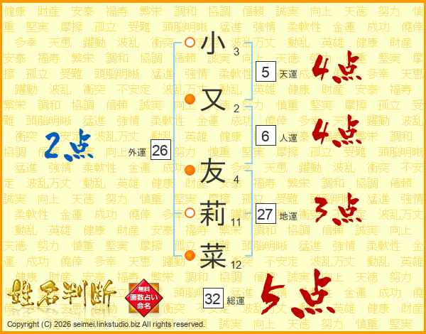小(3画)又(2画) 友(4画)莉(11画)菜(12画)