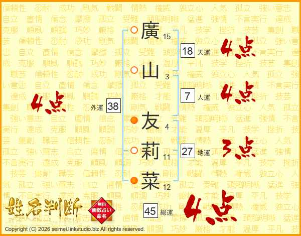 廣(15画)山(3画) 友(4画)莉(11画)菜(12画)