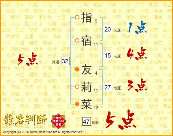 指(9画)宿(11画) 友(4画)莉(11画)菜(12画)