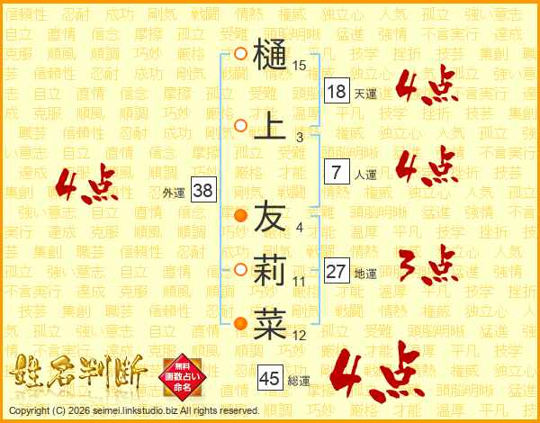 樋上友莉菜さんの外運は38画の4点!