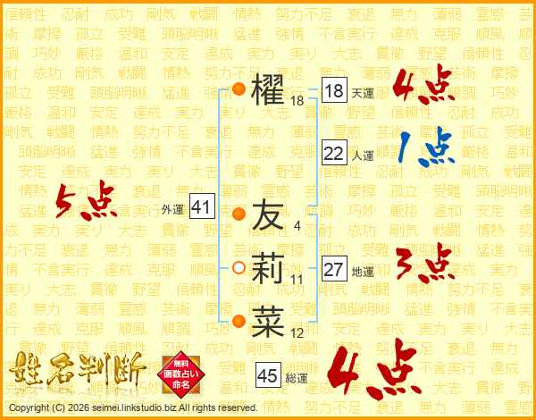櫂友莉菜さんの総運は45画の4点!