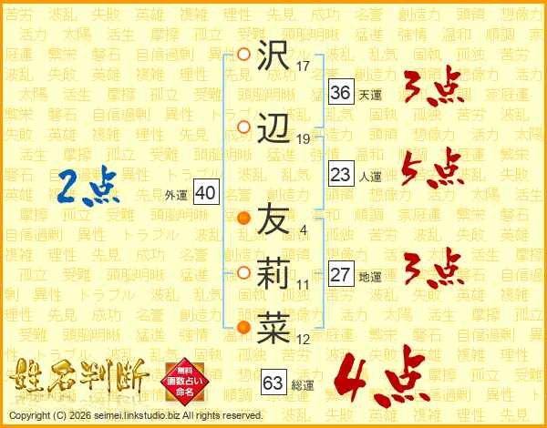 沢(17画)辺(19画) 友(4画)莉(11画)菜(12画)