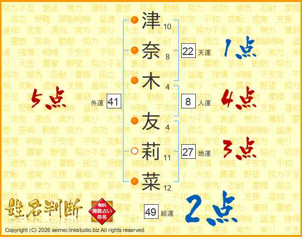 津(10画)奈(8画)木(4画) 友(4画)莉(11画)菜(12画)
