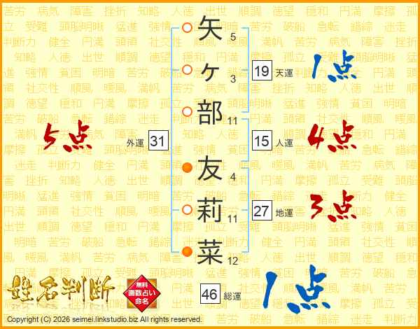 矢ヶ部友莉菜さんの総運は46画の1点!