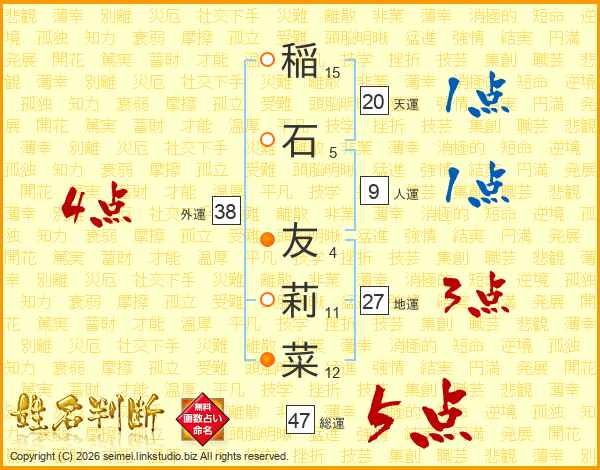稲(15画)石(5画) 友(4画)莉(11画)菜(12画)
