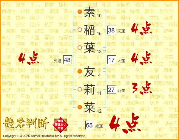素(10画)稲(15画)葉(13画) 友(4画)莉(11画)菜(12画)