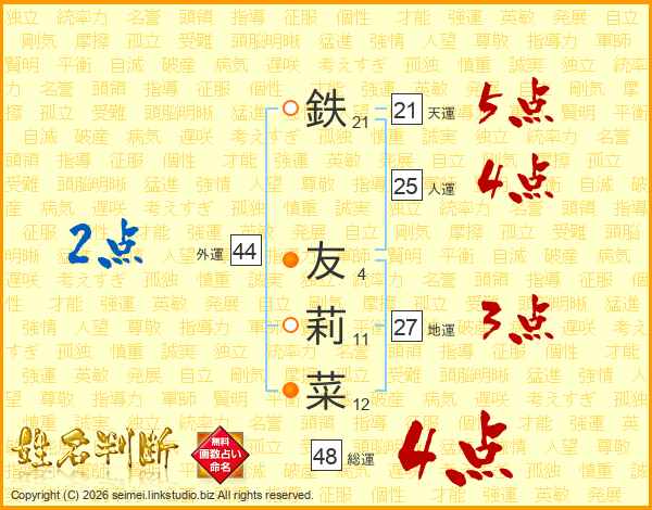 鉄(21画) 友(4画)莉(11画)菜(12画)
