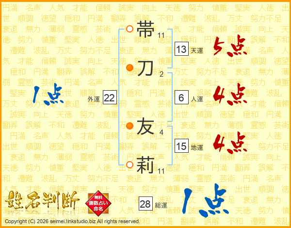 帯刀友莉さんの総運は28画の1点!