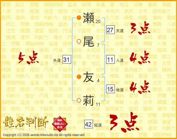 瀬(20画)尾(7画) 友(4画)莉(11画)