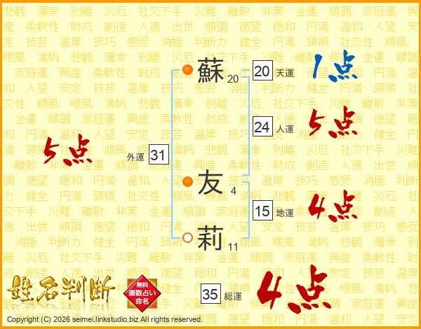 蘇(20画) 友(4画)莉(11画)