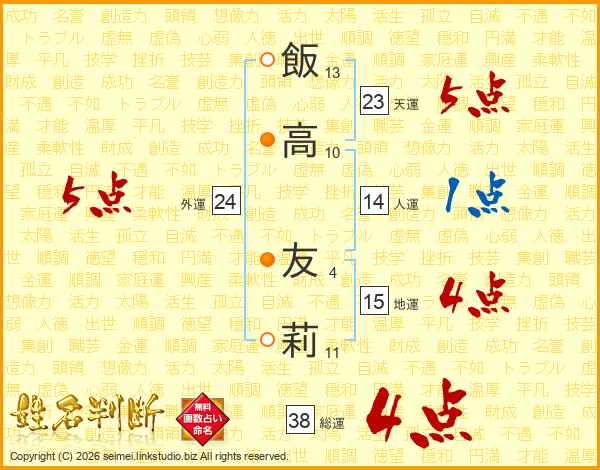 飯高友莉さんの総運は38画の4点!
