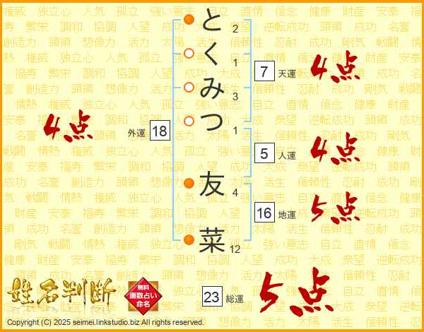 と(2画)く(1画)み(3画)つ(1画) 友(4画)菜(12画)