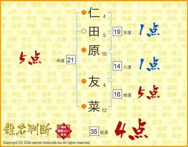 仁(4画)田(5画)原(10画) 友(4画)菜(12画)