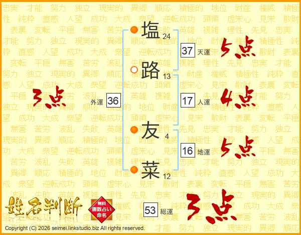 生活面を象徴する運勢です。外部から受ける影響力を表し、結婚運、家庭運や職場、環境への順応性を表します。総運から人運を引いた画数。姓や名が1文字の場合を除く。