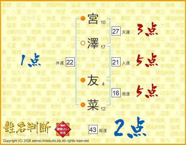 宮澤友菜さんの総運は43画の2点!