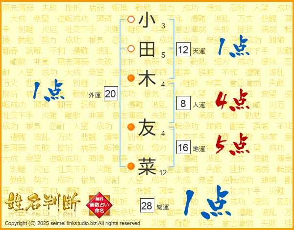 小(3画)田(5画)木(4画) 友(4画)菜(12画)
