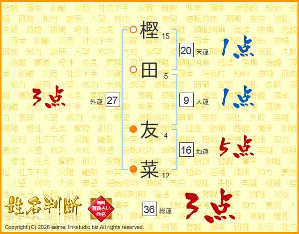 樫(15画)田(5画) 友(4画)菜(12画)