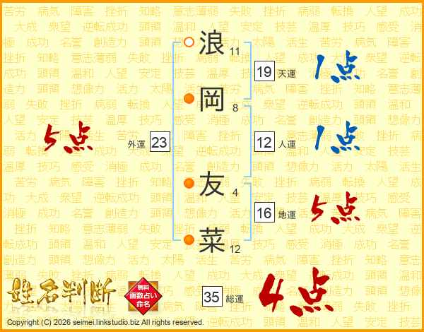 浪(11画)岡(8画) 友(4画)菜(12画)