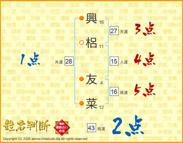 生活面を象徴する運勢です。外部から受ける影響力を表し、結婚運、家庭運や職場、環境への順応性を表します。総運から人運を引いた画数。姓や名が1文字の場合を除く。
