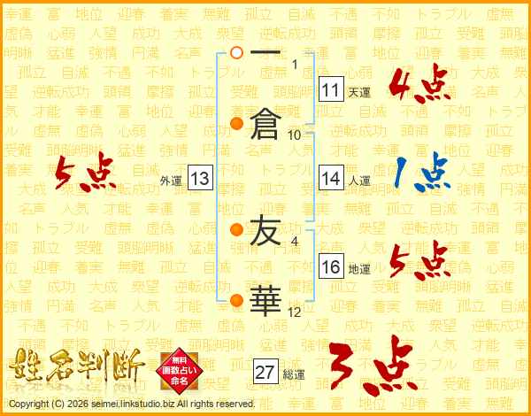 生活面を象徴する運勢です。外部から受ける影響力を表し、結婚運、家庭運や職場、環境への順応性を表します。総運から人運を引いた画数。姓や名が1文字の場合を除く。